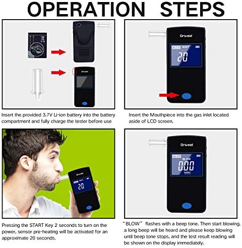 Por lo general se requiere conectar una boquilla al alcoholímetro portátil de prueba, presionar y soltar un botón y cuando la unidad esté lista, soplar en la boquilla. La mayoría de los dispositivos tardan unos cuatro segundos en recoger suficiente aire. Pueden indicarlo con un sonido. Dentro de unos segundos, tendrás una lectura del resultado en una pantalla.