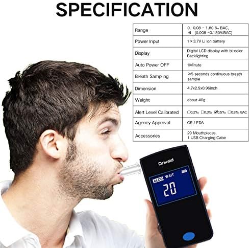 Este modelo funciona con una batería de litio recargable a través de cable USB. En cuestión de segundos, este alcoholímetro digital portátil te indicará si eres apto para conducir. Solo tendrás que apretar un botón y realizarte la prueba. Fácil de usar, viene con 20 boquillas para que también permitas a tus amigos y familiares saber si pueden coger el coche. Para tener un resultado óptimo, te sugerimos que te hagas la prueba 20 minutos después de la última unidad de consumición. Gracias a este alcoholímetro portátil tu seguridad estará garantizada.