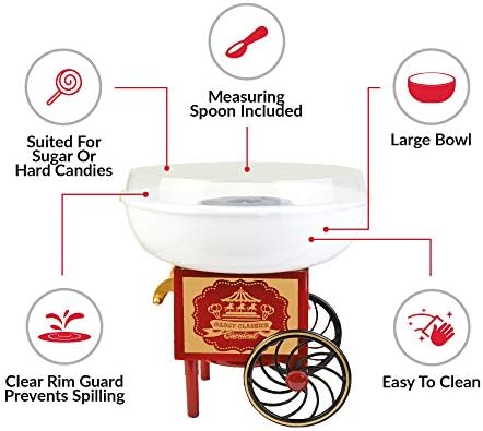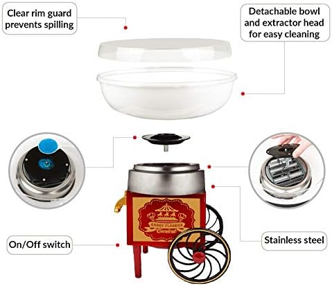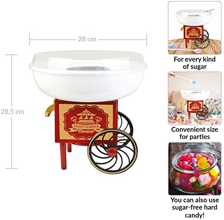 Si quieres revivir los mejores momentos de tu infancia en los que no tenías preocupaciones e ibas a la feria con toda tu familia a comerte un delicioso algodón de azúcar estás en el lugar perfecto. Gracias a esta maravillosa máquina de algodón de azúcar vas a tener una pequeña fábrica de felicidad en tu propia casa porque hacer los mejores algodones nunca había sido tan fácil. Sólo necesitarás un poco de azúcar y trozos de caramelos duros, esperar unos minutos y preparar tu paladar para transportarte a tus mejores años. Será el anfitrión perfecto y el héroe de los peques cuando prueben las delicias de esta magnífica máquina de algodón de azúcar. ¡Te quedarás con la boca abierta cuando veas su precioso diseño retro!.