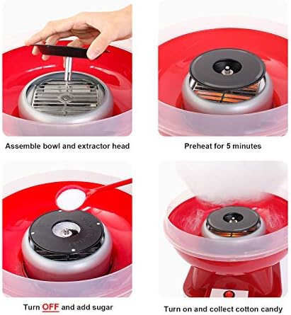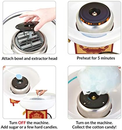 Una vez que te haces adicto al algodón de azúcar, sabes que tienes que seguir unos cuantos trucos para darle a tu especialidad una textura suave, impalpable y experta. Si echa un vistazo a los comentarios de los usuarios, verá que para obtener el mejor resultado no tiene que apurarse: es mejor dejar que esta completa máquina de algodón de azúcar funcione durante un par de minutos antes de añadir azúcar.