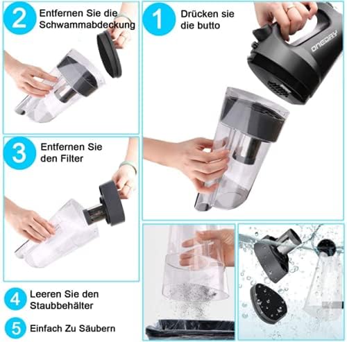 Por ejemplo, está la simple desconexión de la unidad de succión, que puede ser liberada del cuerpo con una ligera pulsación de un botón. En un abrir y cerrar de ojos, tienes una aspiradora de mano que puede ser usada para aspirar rápidamente el coche o para limpiar un pequeño contratiempo en la mesa del desayuno.