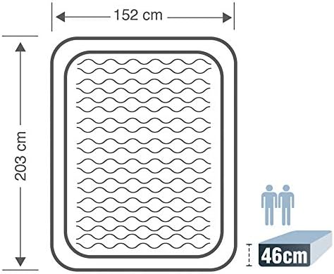Esta cama de Intex, equipado con tecnología Fiber-Tech, cuenta con unas medidas de 152x203x46 cm y una capacidad de peso máxima de 273kg. Su diseño de estructura flocada lo vuelve resistente al agua, a las perforaciones y al uso prolongado.