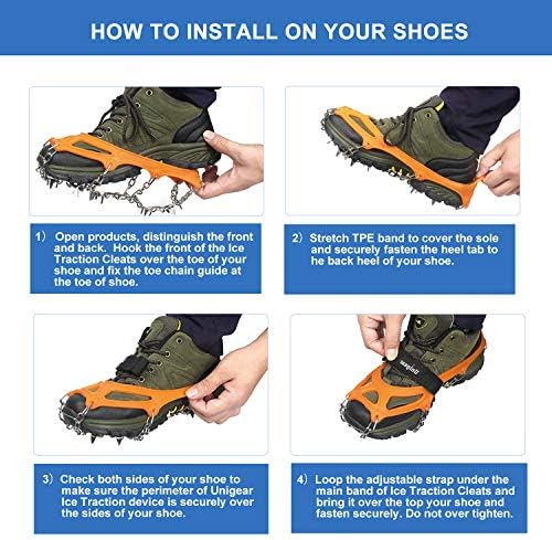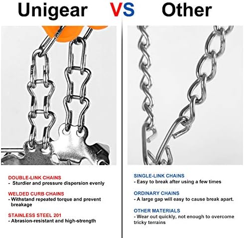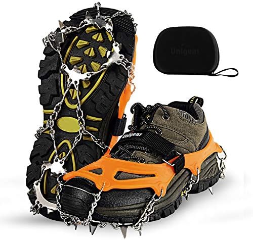 Estos crampones de Unigear son su versión más mejorada; sus 18 excelentes puntos de agarre los convierten en los mejores crampones del mercado, ya que ofrecen un agarre más óptimo y una seguridad de anclaje al suelo, ya sea barro, hielo, nieve o incluso piedras. Están elaborado con acero inoxidable de alta calidad, tratado térmicamente, lo que aporta a estos crampones una durabilidad inigualable y una total cuidado anticorrosión.