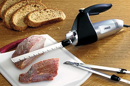 Este cuchillo eléctrico de Princess presenta una innovación en el mercado, se ha añadido al cuchillo eléctrico convencional, un asa ergonómica para evitar que tus manos y brazos sufran cansancio o molestias. Incluye dos juegos de cuchillas, una cuchilla de diente fino para pan y otros alimentos más blandos, y otra cuchilla de diente grueso para alimentos como carnes con hueso e incluso, productos congelados.