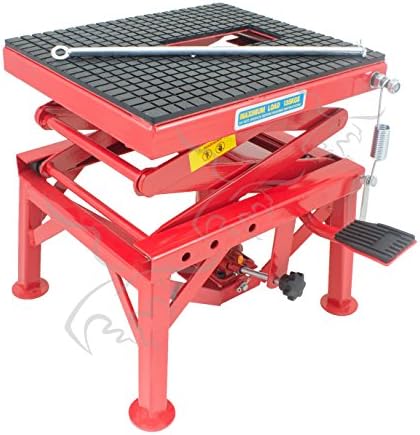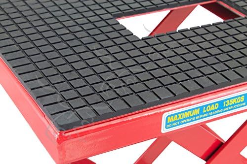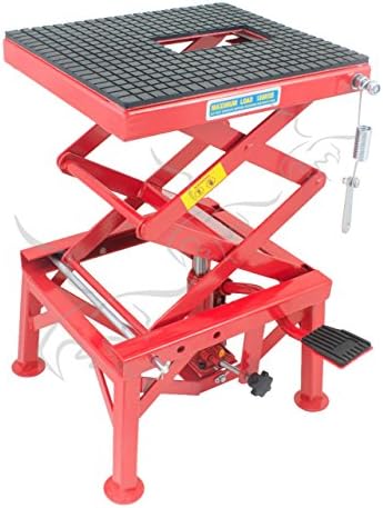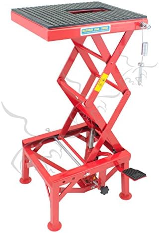 Este elevador de gato hidráulico cuenta con una plataforma que eleva hasta 135 kg. Para garantizar tu seguridad, este modelo viene con tres niveles de bloqueo y barra de seguridad. Su funcionamiento se basa mediante el pedal sobre una base engomada. Se trata de uno de las elevadoras de gatos hidráulicos con mejor relación calidad-precio. Nosotros recomendamos este producto para motos.