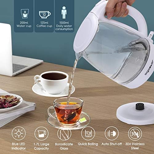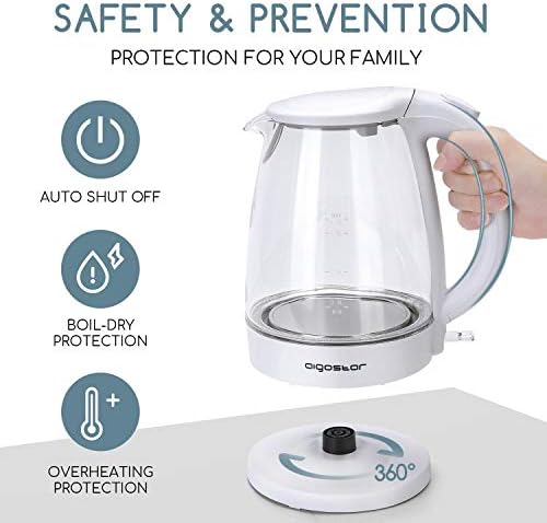 Si te gusta relajarte con una buena taza de té o café por la mañana y empezar el día con una sonrisa este hervidor eléctrico es perfecto para ti porque está cargado de sorpresas que te facilitarán la vida. Disfruta de una bonita luz led cuando el hervidor eléctrico esté funcionando y haz que sea tu nuevo compañero durante muchos años porque está hecho con vidrio borosilicato para que tenga una larga duración. No sufras por la seguridad de tus pequeños porque el increíble sistema de seguridad de este hervidor eléctrico te dejará sin palabras cuando se desconecte automáticamente al no detectar agua. Presume cuando vayan a tu casa a merendar y vean el precioso diseño de este hervidor eléctrico con filtro ultrafino de agua y compartimento para el cable. ¡Serás la envidia de todos!.
