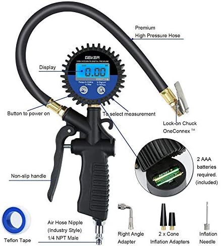 Nos encanta este GEKER por su gran exactitud. Este medidor de presión para neumáticos incluye un sistema de regulador avanzado que te proporciona los datos con precisión. Como otro modelos, éste también viene con pantalla LCD. Este producto es de gran calidad, como indica su desarrollada tecnología para desinflar y su capacidad de ahorrar energía. Fabricado con nylon, este medidor de presión para neumáticos destaca por su resistencia a condiciones climatológicas de mucho calor.