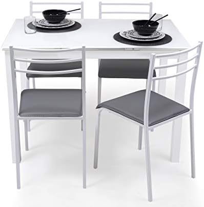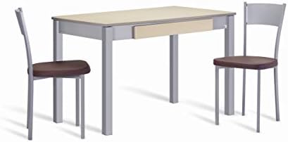 La mesa de cocina extensible Nakura es una de las opciones mas modernas en el mercado. Se trata de un sencillo juego de mesas con cuatro sillas incluidas. Cuenta con unas dimensiones aproximadas de 110×70, sin embargo, al ser extensible precisamente, se puede alargar a mas centímetros de largo (170 cm). ¡Ésta es una solución muy eficaz a esas cenas de amigos improvisadas! Sus cuatro asientos metálicos están cubiertos de polipiel blanco.