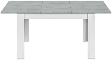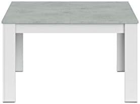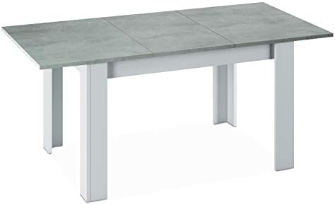 Esta es una mesa de comedor extensible de madera que posee dos posiciones, una más compacta de 140cm de largo, y la otra extendida, de 190cm de largo. Sus medidas completas son de 140/190 x 90 x 78cm, y está hecha de materiales de calidad, recubiertos de melanina de larga durabilidad y resistente al agua, de color blanco y gris cemento. Su superficie es no es porosa, pero sí muy resistente, lo que la hace fácil de limpiar.