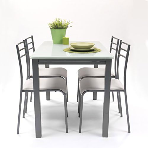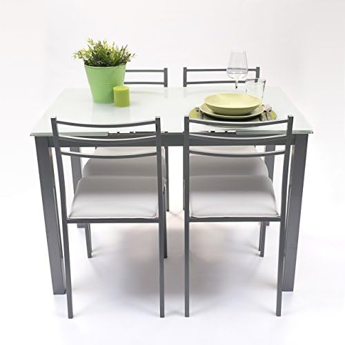 La mesa, la cual posee una estructura metálica y una tapa de cristal templado, tiene un diseño simple pero efectivo, mientras que las sillas con asiento en polipiel blanco son cómodas y combinan con el diseño de la mesa, al ser también de metal.