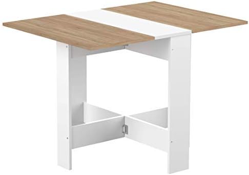 Esta mesa de cocina plegable es algo más pequeña y modesta que la mesa anterior. Construida en madera, destaca por sus paneles de melanina de 16mm y un diseño que sobresale por sus tonos blancos en la base y centro de la mesa, combinado con dos tablas de roble natural para las planchas plegables.
