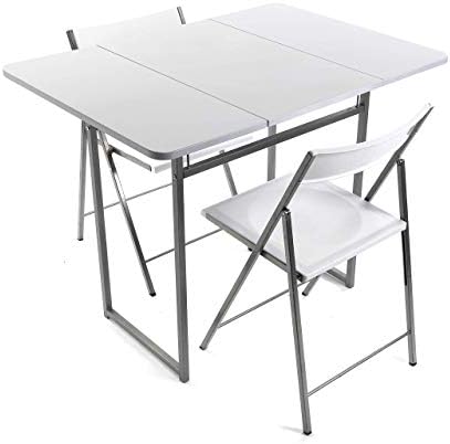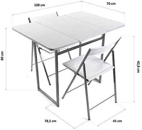 En cuanto a sus dimensiones, abierta posee un tamaño de 100 x 70 x 80 cm, y cerrada de 70 x 45 x 80 cm. Además de la mesa, el paquete también incluye dos sillas a juego con la mesa.