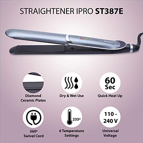 La plancha de pelo BaByliss ST387E es una de las más populares del mercado. Es ideal para todo tipo de cabello, sobre todo para el de hebra gruesa y abundante. Sus placas profesionales extras largas revestidas en cerámica proporcionan sedosidad, brillo, y suavidad al cabello.Â