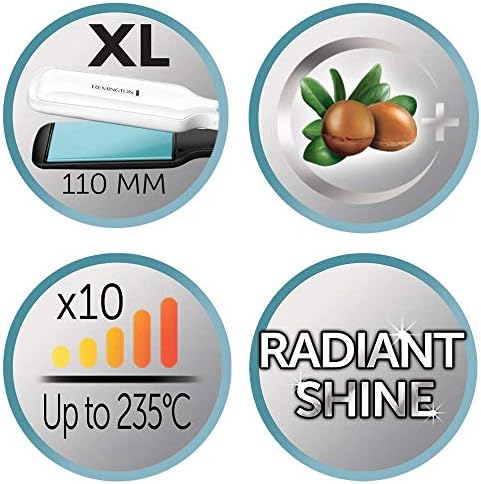 Esta plancha de pelo tiene placas de cerámica con un revestimiento especial en argán marroquÃ, que produce mayor sedosidad y brillo en el cabello. Estas placas son extralargas con medidas de 110 x 50 mm, perfectas para cabello rizado y largo.Â