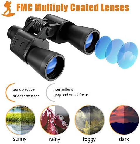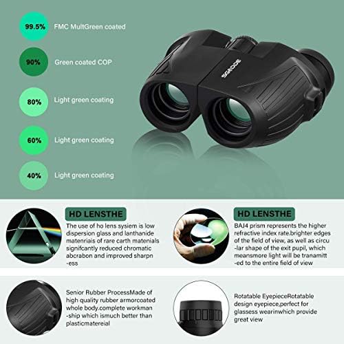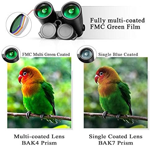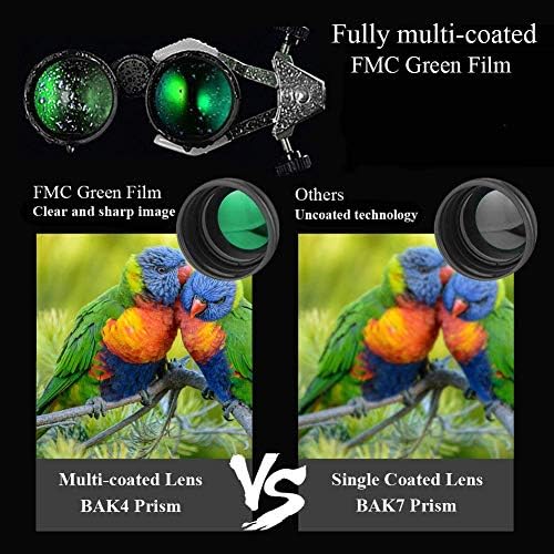 Como la mayoría de los prismáticos innovadores, sus lentes están hechas de prisma BAK4 y cubiertos con película verde FMC. Estos binoculares le ofrecerán una visión clara, de larga distancia y fantástica durante su viaje. Fáciles de enfocar y manejo, son ideales para la caza, ornitología, camping y otras muchas actividades en exteriores como en interiores.