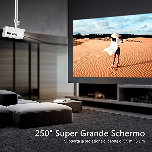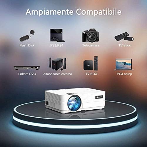Comencemos ofreciéndole un proyector que es capaz, aunque muy barato, de soportar contenidos de vídeo hasta Full HD, proyectando en la pared con una resolución de 840 x 480. Con un brillo de 1200 lúmenes, puede mostrar imágenes tanto en la oscuridad como en una habitación perfectamente oscurecida, no tendrá problemas particulares de brillo a menos que ilumine la habitación con una lámpara de araña o la luz del día.