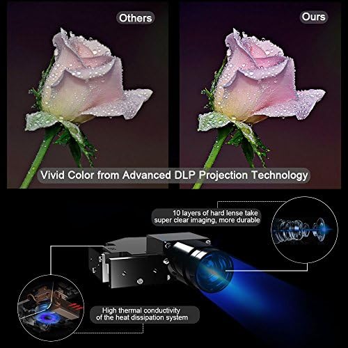 Si quieres un proyector DLP transportable para enchufar el móvil o tu portátil, esta es tu mejor opción. No solo es compacto y ligero, sino que también te da la posibilidad de colocarlo tanto en el techo, trípode como en la pared. Su conexión multimedia permite que puedas conectar todos tus dispositivos electrónicos sin necesidad de poner esos cables de más. Nos encanta que este proyector DLP portátil sea táctil, y cuente con entradas variadas como HDMI, Tarjeta TF, Wifi o dos puertos USB.