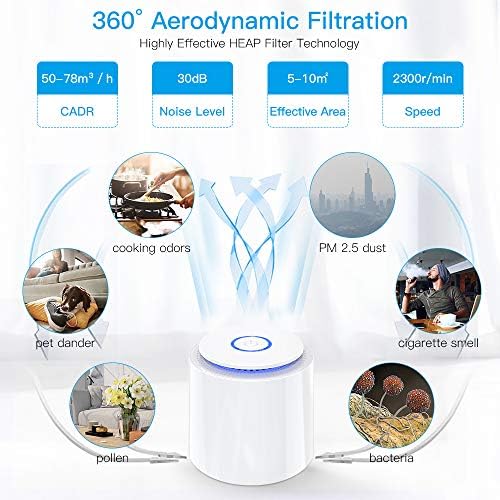 Con un diseño desmontable muy estético, este purificador de aire también dispone de modo silencioso y función nocturna con luz. Su funcionamiento 360º se encarga de distribuir aire mediante un conducto que expulsa las ráfagas a tan solo 32 dB. Cuenta con una velocidad de 2300 rpm y potencia de 2 vatios. Sus filtros tienen una vida útil de máximo seis meses, por lo que es aconsejable que tengas otro preparado para que tu casa esté siempre a higiénica.