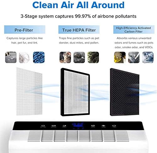 Como hemos estado viendo en el resto de modelos, estos purificadores de aire aseguran eliminar hasta el 99,7% de partículas como caspa de perro, bacterias, polen o virus que residen en el aire de casa. La diferencia con los demás productos es que este purificador de aire es uno de los más eficientes de la lista, ya que cuenta con un funcionamiento sencillo pero práctico. Podrás dejarlo encendido y programarlo para que se apague automáticamente a lo largo del día, algo muy beneficioso si quieres llegar después de trabajar a una casa esterilizada y sin partículas nocivas para la salud.