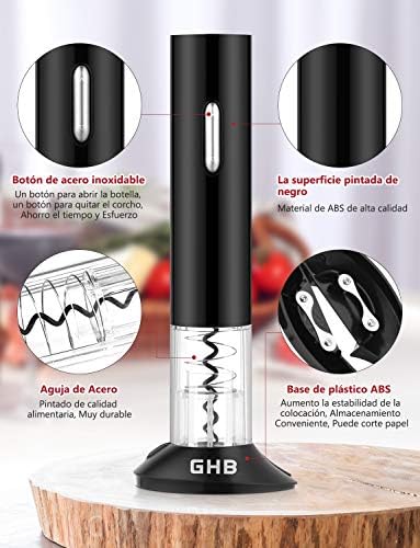 Estos modelos utilizan la energÃa de las baterÃas (del tipo desechables o recargables) y hacen todo el trabajo por ti. Ponga el dispositivo en la parte superior de la botella de vino, pulse un botón y el corcho saldrá en segundos.