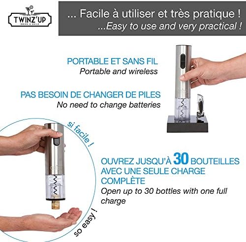 Para comenzar, funciona con baterÃas o puede estar equipado con un soporte recargable para conectarse a la alimentación. Tanto en el primer como en el segundo caso, puede llevarlo, tal vez durante un viaje o cuando vaya de picnic. El funcionamiento del sacacorchos eléctrico es absolutamente muy simple, en primer lugar, debe colocarlo en la parte superior de la botella y presionar el botón, luego la espiral comenzará a girar en sentido horario hasta que haya entrado por completo en la tapa. Luego, usando el botón automático, la espiral del sacacorchos eléctrico comenzará a girar en sentido antihorario y en poco tiempo se liberará el intenso aroma del vino.