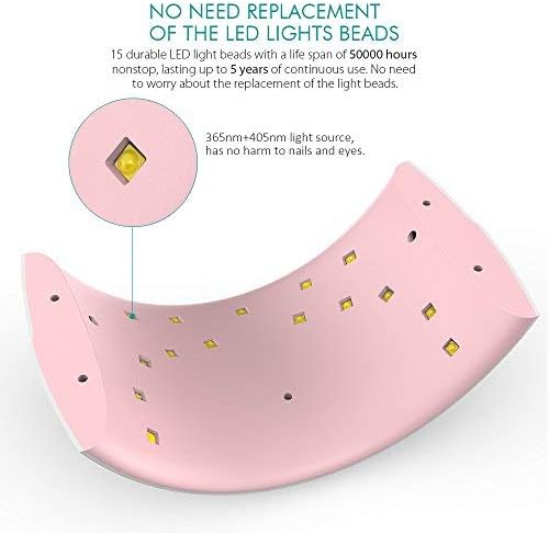 La luz de este secador de uñas es amigable con tu piel, uñas y ojos. Este modelo presenta un diseño compacto y sumamente duradero. Cuenta con 15 perlas de luz LED que rinden hasta 5 años de uso continuo y son más eficientes que las luces UV y CCFL + UV. Incluso secan 50% más rápido. Su fuente de luz es dual, de manera que sirve para secar geles acrílicos, extendidos, de escultura, esmaltes, cola de gema y distintos materiales de manicura. También incluye un sensor de luz infrarroja que detecta cuando la mano está debajo del dispositivo para emitir la luz LED.