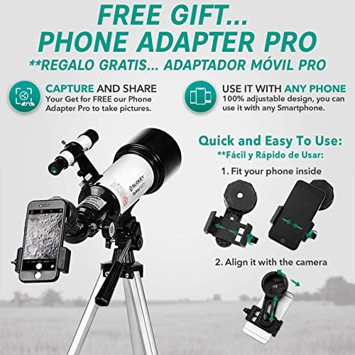 Este telescopio es compatible con smartphones de varios modelos, para poder tomar fotos y vídeos de las imágenes con total facilidad, ¡tu galería será alucinante! Entre la adaptación del teléfono y el trípode ajustable, podrás mejorar tu hobbie notablemente y, además, se trata de un telescopio impermeable, así que no tendrás problema de usarlo en ambientes húmedos o en jornadas de lluvia.